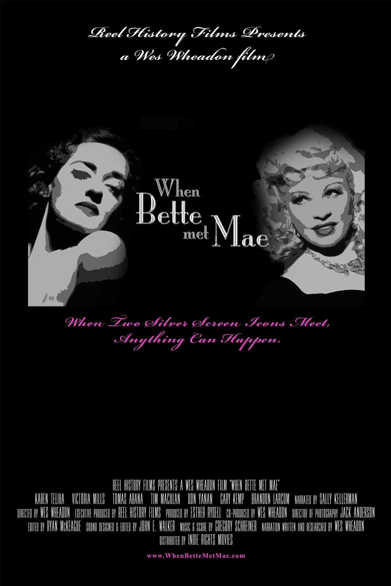 Bette Davis and Mae West on the night of the dinner party. Copyright Wes Wheadon, all rights reservedVictoria Mills as Mae West and Karen Teliha as Bette Davis. Copyright Reel History Films, all rights reservedVik Greenfield, Bette Davis, Wes Wheadon and Mae West on the night of the dinner party. Copyright Wes Wheadon, all rights reserved.Tim Maculan as Vik Greenfield, Karen Teliha as Bette Davis, Brandon Larcom as Wes Wheadon, and Victoria Mills as Mae West star in the film WHEN BETTE MET MAE. Copyright Reel History Films, all rights reserved.Karen Teliha as Bette Davis in the film WHEN BETTE MET MAE. Copyright Reel History Films, all rights reserved.Victoria Mills as Mae West in the film WHEN BETTE MET MAE. Copyright Reel History Films, all rights reserved.
